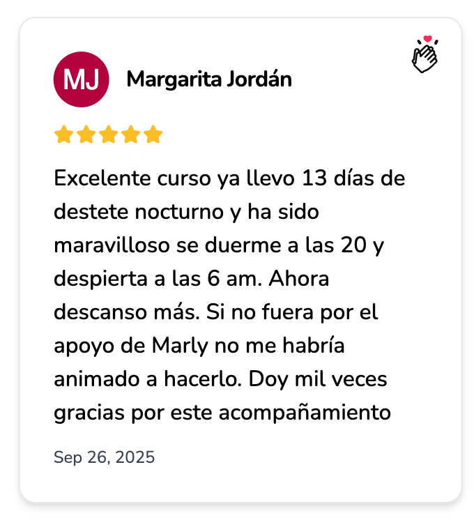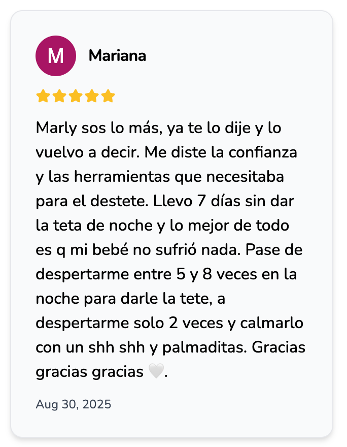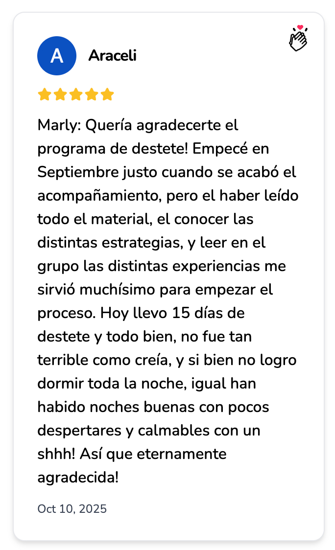 Logra un destete sin entrenamientos de sueño y sin lágrimas, con mi acompañamiento de 21 días por WhatsApp + 3 sesiones en vivo para avanzar paso a paso.